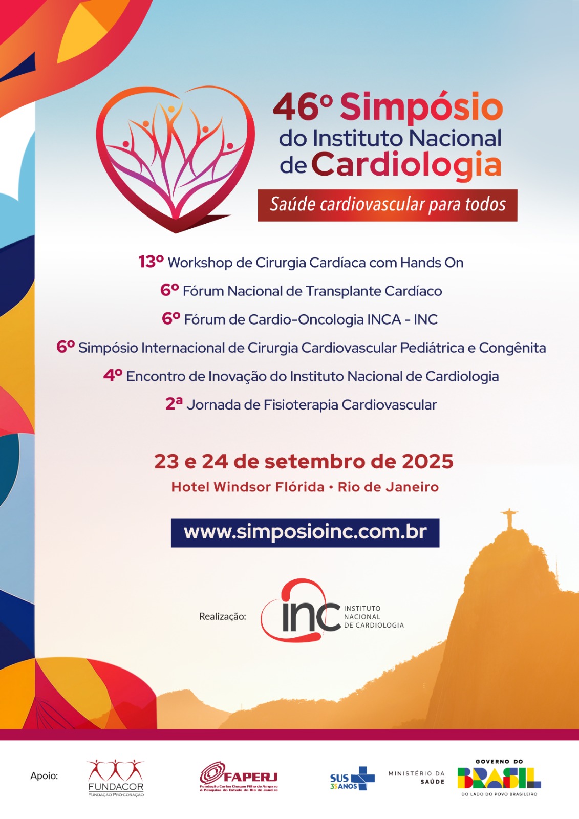 O 46º Simpósio do Instituto Nacional de Cardiologia acontecerá nos dias 23 e 24 de setembro de 2025, no Hotel Windsor Flórida, no Flamengo. Tem por tema “Saúde Cardiovascular para Todos”. É um evento totalmente gratuito aos participantes e de excelência, envolvendo os profissionais do INC, sendo seu maior evento científico anual. Estarão envolvidos convidados de outras instituições de saúde do Rio de Janeiro, como o INCA, a UFF, UERJ, UFRJ, autoridades da área da saúde e convidados nacionais e internacionais.